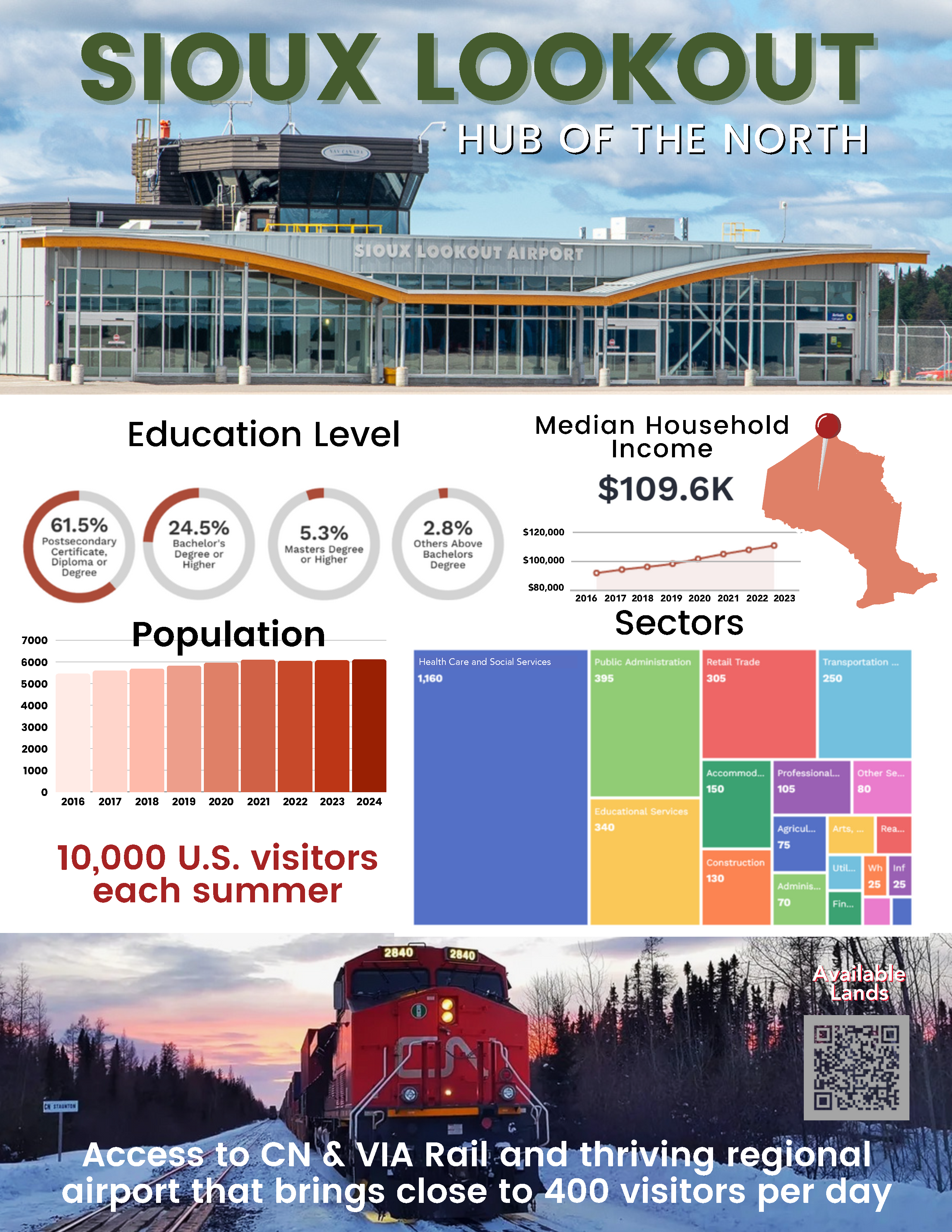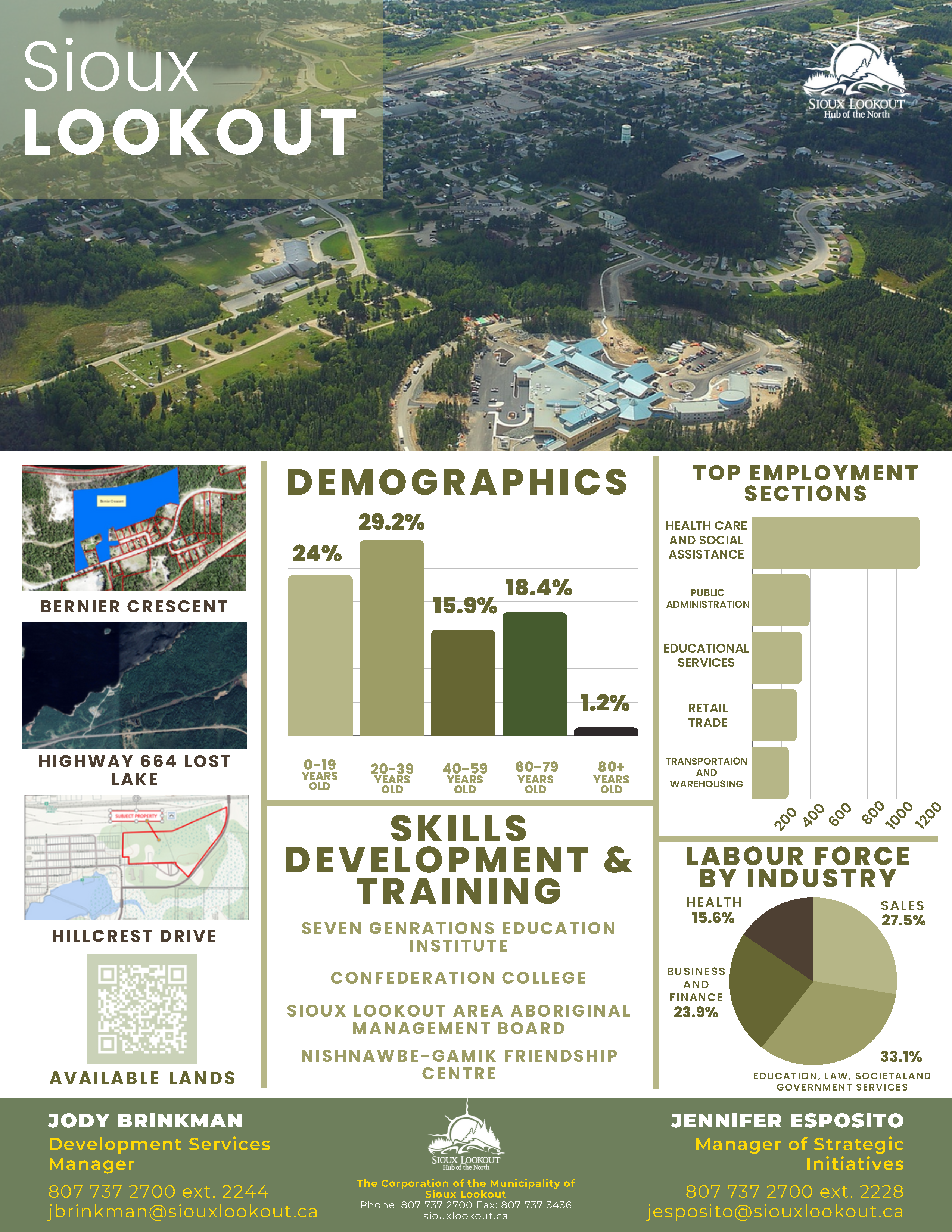 The property is comprised of one parcel with a total site size of 19.58 acres with the developable table land having approximately 10.70 acres (based on site plan) having frontage along Hillcrest Drive. The property is designated Mixed-Use within the Sioux Lookout Official Plan (2018) and is zoned “MU – Mixed-Use 2 (h)” within Zoning By-Law 85-18. The Municipality of Sioux Lookout is proposing to develop the subject lands with multiple serviced commercial lots and a common area parking with shared maintenance fees. Subsurface infrastructure has been installed and all predevelopment work has been completed. Enclosed conceptual drawings outline the Municipality's vision for this property.
