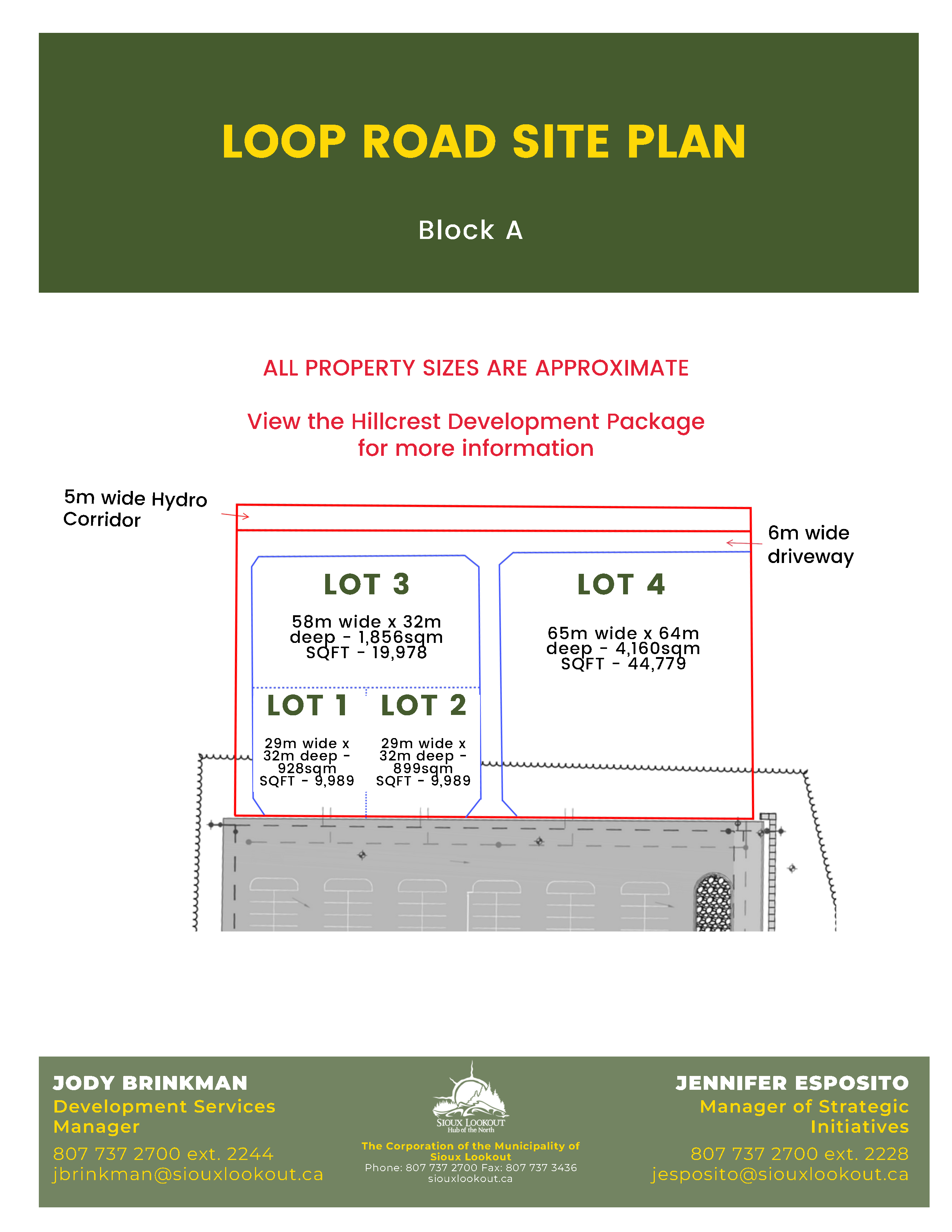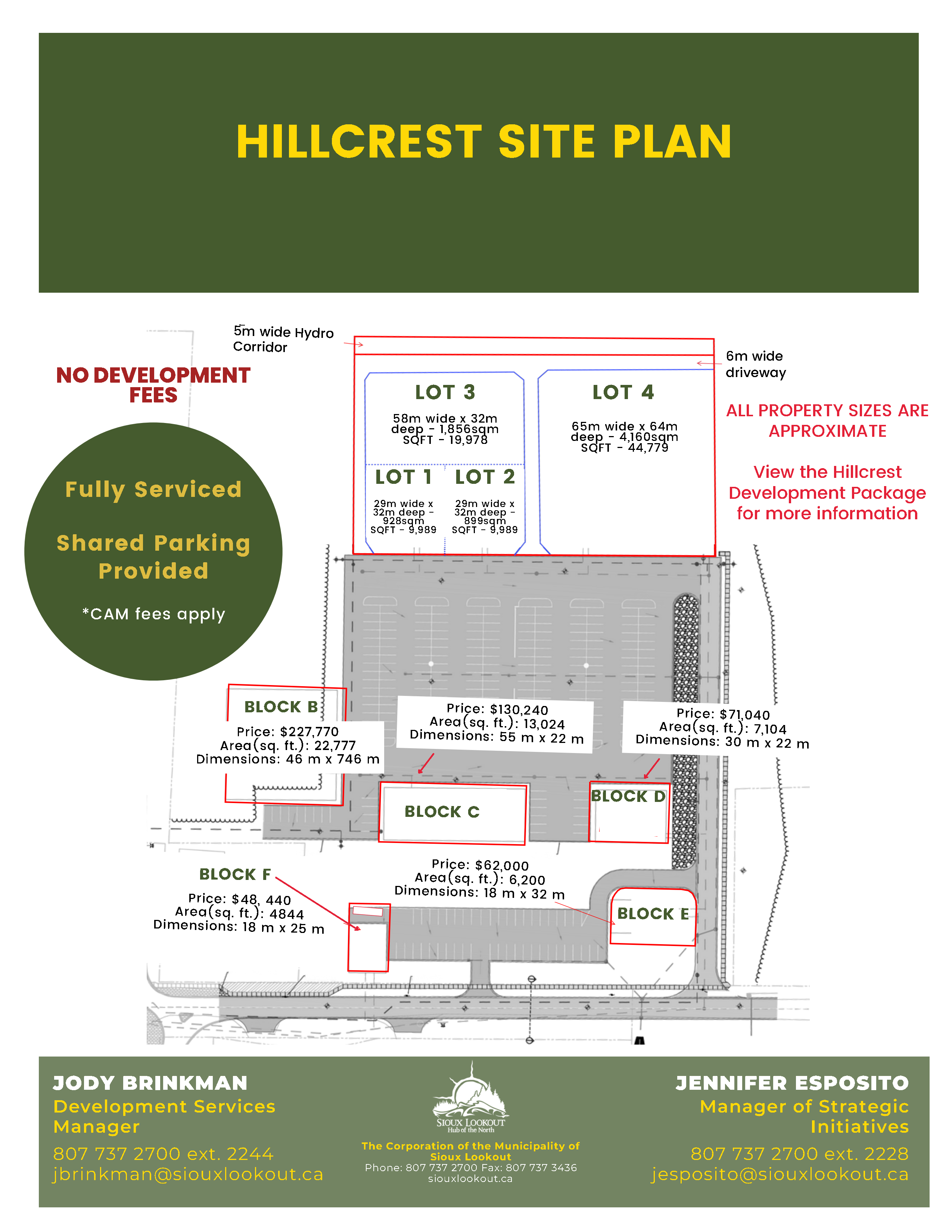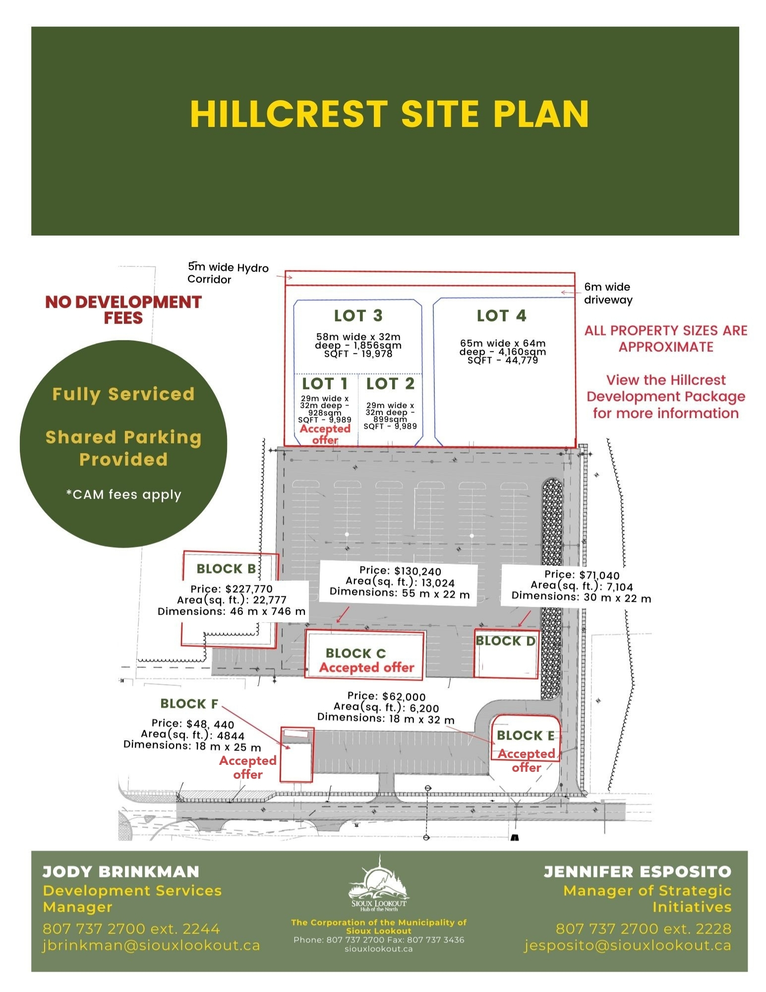 *Note: Prices vary depending on lot size, as outlined in the attached development package. Suggested lot sizes and prices range from $48,440 - $1,031,750. There is currently no Municipal address for this property - the property is a vacant parcel of land on the north side of Hillcrest Drive.